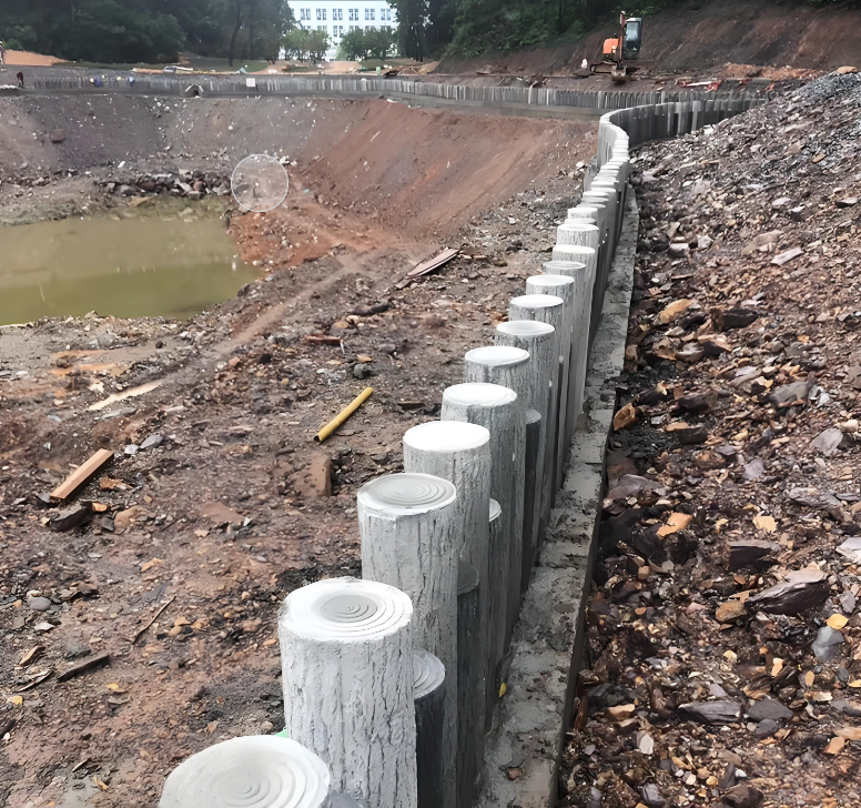 河道邊的土大多是淤泥、軟土,有的還夾雜石頭、樹根。施工前一定要用洛陽鏟或探測儀查土質(zhì),比如淤泥層有多厚、下面有沒有硬土層。要是淤泥太厚,直接打樁容易 “打空”,樁會(huì)往下陷,這時(shí)候就得先清淤,或者用碎石墊一層 “打底”;要是有石頭、樹根,不清理掉會(huì)把樁頂裂,還會(huì)讓樁打不直。水泥仿木樁施工隊(duì)泓樺錦嘉去年在蘇州某河道施工,清出了不少樹根,要是沒清,至少一半的樁得廢。3. 算好樁的規(guī)格:別用 “小身板” 扛大壓力